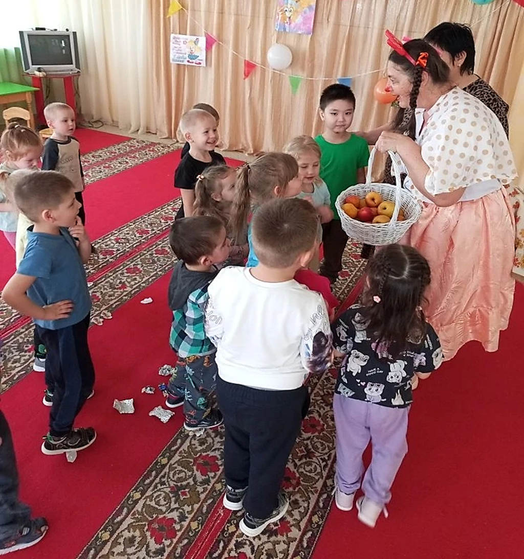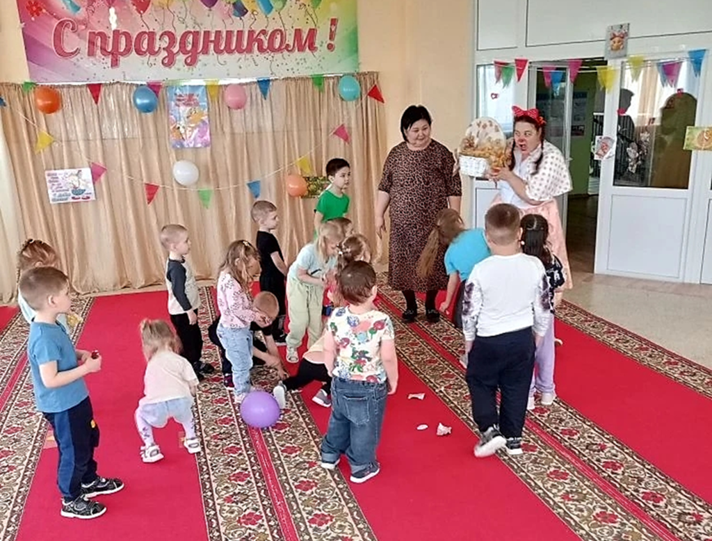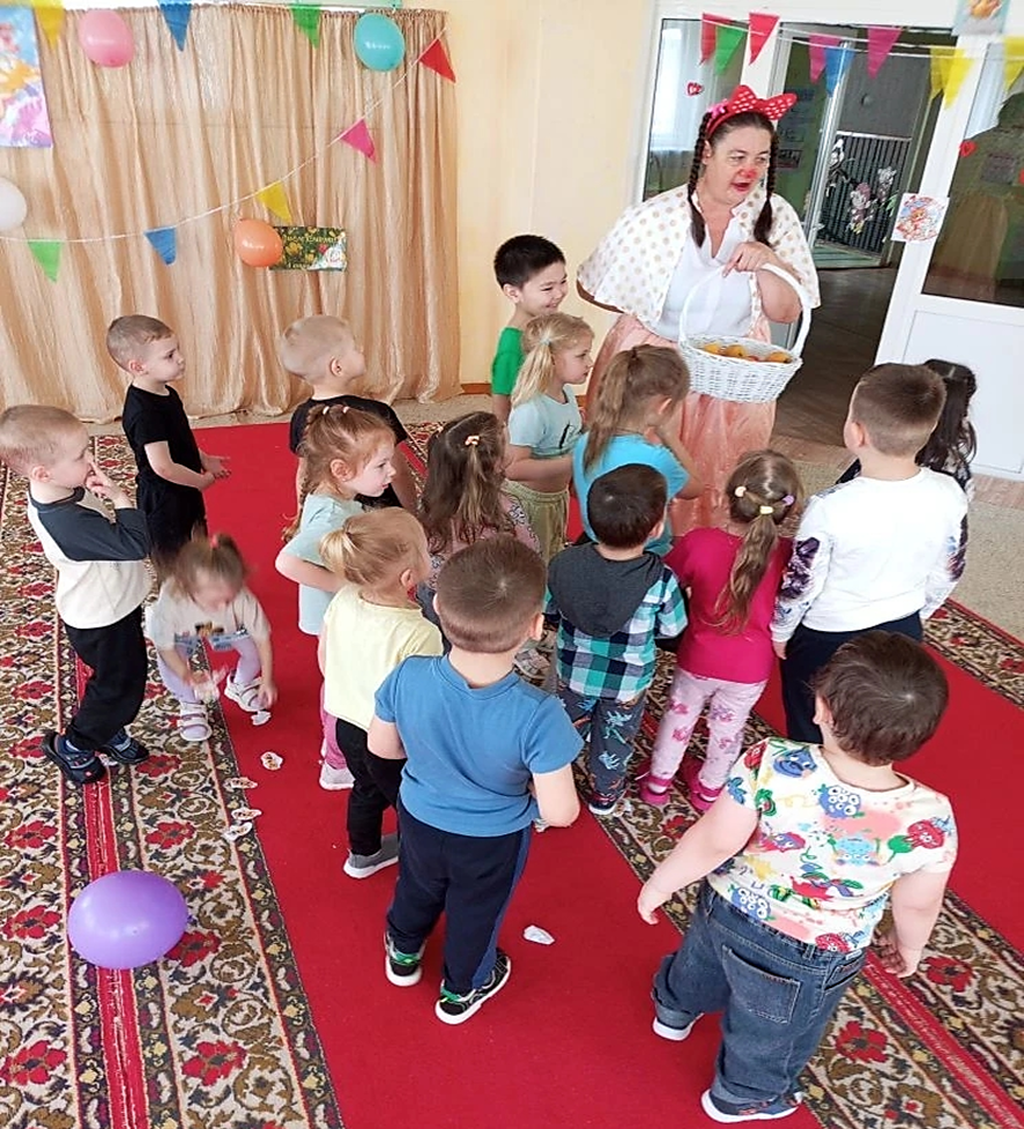 К детям в гости пришла клоунесса Ириска. Она провела веселые конкуры, игры и викторины. Дети веселились и очень звонко смеялись.